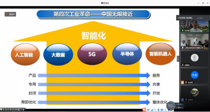 在本次活动中,首先,山西云时代技术有限公司苏经理发表讲话,介绍了云时代技术有限公司的规模、业务、发展前景等,并强调新基建对于当代社会经济发展中的重要作用。接着会议主讲人赵志耘教授从国家层面引出新基建的重要性。一方面,新基建符合我们国家三个面向的要求;另一方面,习近平总书记强调要以经济和科技的融合为切入点,国家对科技创新和产业创新以及人工智能等都高度重视。新基建前所未有地进入到高层的布局之中。接下来,赵志耘博士从新基建的出台背景、新基建的重要领域以及新基建的未来展望三个方面详细讲述新基建带来的新机遇。