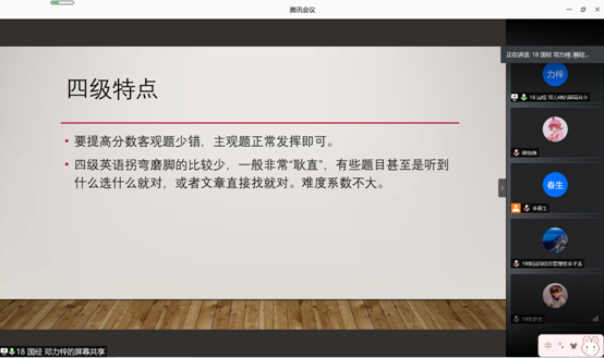 随后,进入了本次讲座的主题。首先,邓力梓同学给同学们分析和解读了英语四级考试的特点,如题目与答案一般较为直观,等等。接下来,他从听力、阅读、写作与翻译三类题型入手,分别介绍了相应的训练方法。如听力中的新闻题目,需要捕捉文章中的关键词,并在听的过程中有效记录;阅读中的十五选十,对单词的要求较高,对于该部分要注重单词的积累;作文的首尾十分重要,且字迹要书写规范,等等。最后,邓力梓同学针对不同程度、不同目标的同学提出了不同的复习策略和方法。