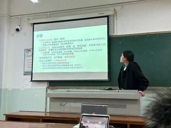 韩冰同学以《聚类分析》为主题,基于不同的角度详细地进行了分类:基于划分的聚类、基于层次的聚类、基于密度的聚类、基于网格的聚类和基于模型的聚类。聚类分析被广泛应用于银行、零售和保险等众多领域,有利于制定更有效的管理策略以及优化投资组合。康老师进一步向大家介绍了其中具体方法的应用,强调了实践的重要性,同学们都受益良多。