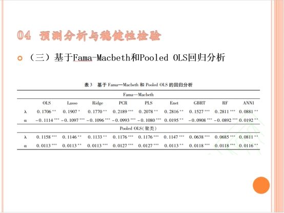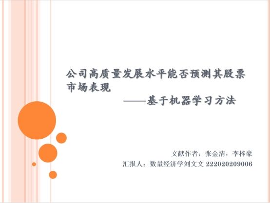 刘文文同学以《公司高质量发展水平能否预测其股票市场表现——基于机器学习方法》为主题进行分享。本篇文章从高质量发展理念出发,基于“创新、协调、绿色、开放、共享”五大新发展理念建立高质量发展指标体系,应用九种机器学习方法对股票收益率进行预测,并对指标体系各变量的重要性、成分预测能力的变化以及预测能力来源进行探究。研究结果表明高质量发展预测能力来源于投资者对信息的反应不足,可以为资本市场定价机制的完善提供理论指导。